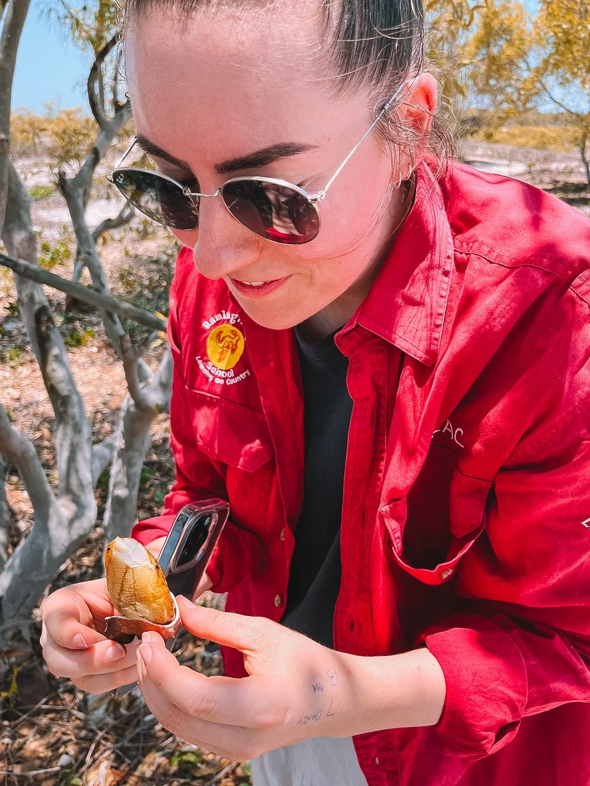 First time on 'learning on country' eating fresh Nyoka’ (crab) cooked on the fire.